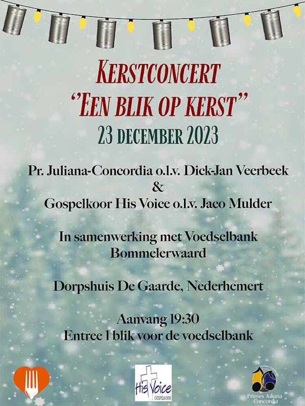 Op 23 december geeft Fanfarecombinatie Prinses Juliana-Concordia een kerstconcert in samenwerking met Gospelkoor His Voice en Voedselbank Bommelerwaard een kerstconcert. Het belooft weer een mooie muzikale avond te worden dus kom vooral kijken!
