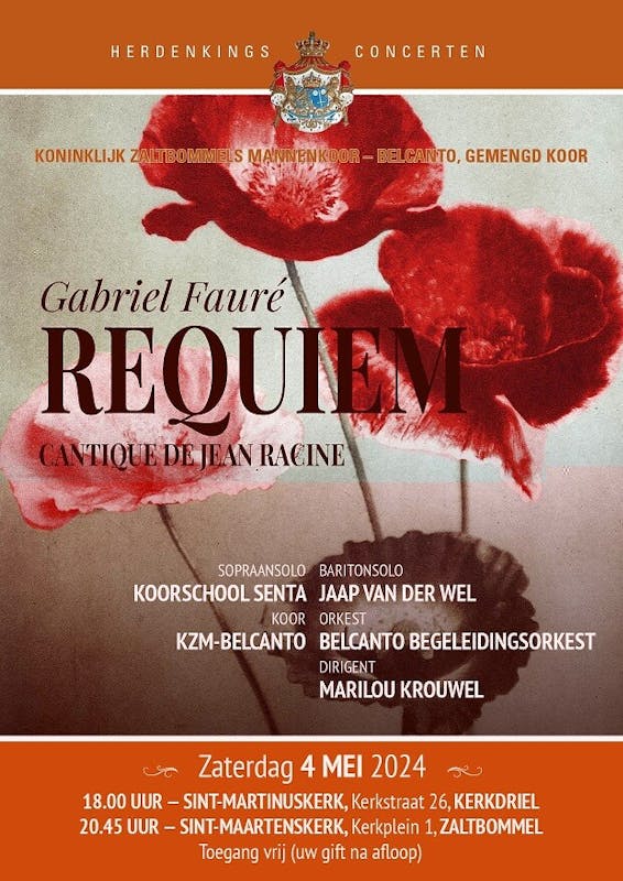 Koninklijk Zaltbommels Mannenkoor (KZM-Belcanto) - gemengd koor / Bommelerwaard voert bij de Nationale Dodenherdenking op 4 mei 2024 het Requiem en Cantique de Jean Racine uit, beide van Gabriel Fauré. De algehele leiding is in handen van dirigent Marilou Krouwel. Bariton: Jaap van der Wel, Sopraanpartij: Koorschool Senta, Orkest: Belcanto Begeleidingsorkest.