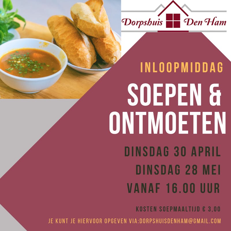 Op dinsdag 30 april a.s. organiseren we een inloopmiddag in het dorpshuis. Deze middag ben je van harte welkom om tussen 16.00 en 18.00 uur binnen te lopen voor een praatje, een kopje koffie of om samen een heerlijke maaltijdsoep te koken in onze vernieuwde keuken.