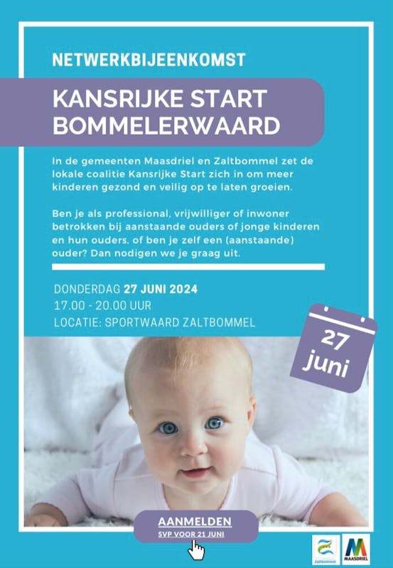 In de gemeenten Maasdriel en Zaltbommel zet de lokale coalitie Kansrijke Start zich in om meer kinderen gezond en veilig op te laten groeien. Ben je als professional, vrijwilliger of inwoner betrokken bij aanstaande ouders of jonge kinderen en hun ouders, of ben je zelf een (aanstaande) ouder? Dan nodigen we je graag uit.