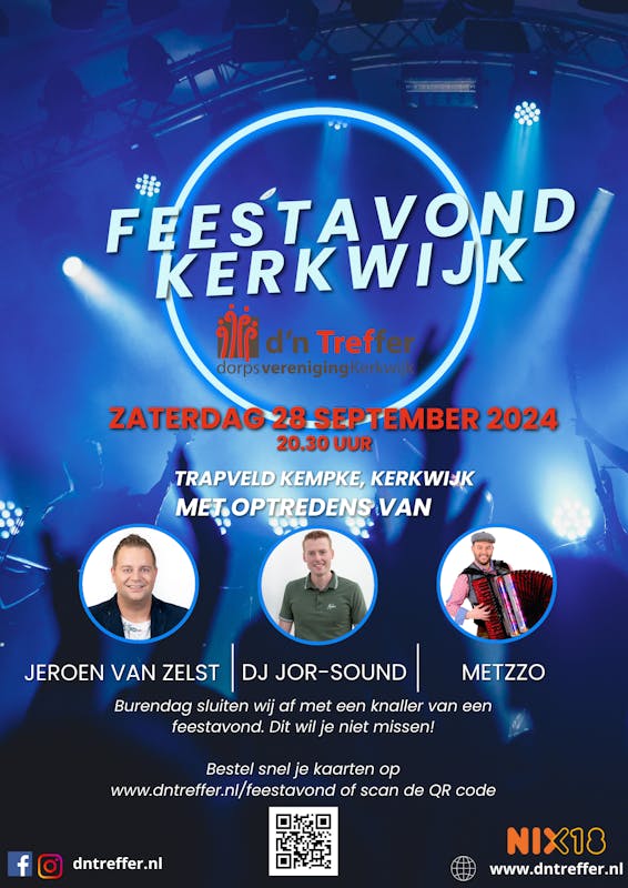 Bestel je kaarten via www.dntreffer.nl/feestavond of scan de QR code op de flyer.