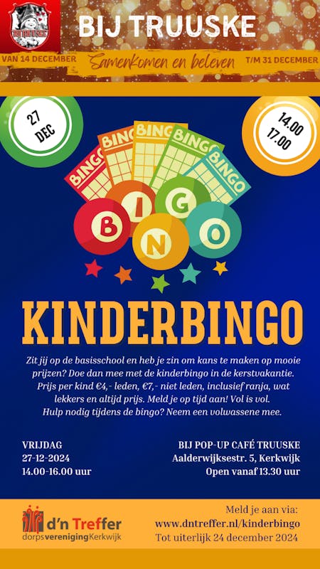 Maak kans op mooie prijzen bij de kinderbingo! Deze speciale kindereditie is bedoeld voor kinderen van groep 4-8. Aanmelden kan tot en met 24 december en kost €4,- per kind voor leden en €7,- per kind voor niet-leden. Meld je aan via www.dntreffer.nl/kinderbingo