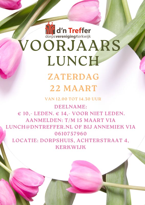 Op zaterdag 22 maart vindt van 12.00 tot 14.30 uur de voorjaarslunch plaats in het dorpshuis in Kerkwijk.