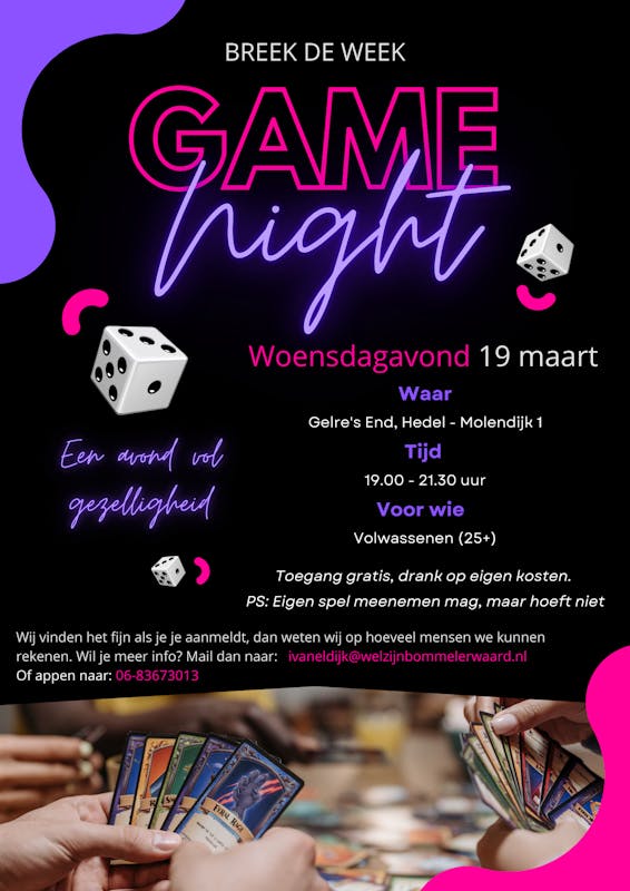 Welkom bij de spellenavond: breek de week! Ontsnap aan de dagelijkse routine en kom op woensdagavond 19 maart naar onze eerste spellenavond voor 25-plussers. Hou je van kaartspellen, bordspellen of gezelligheid? Dit is jouw kans om te ontspannen en mensen te ontmoeten die jouw passie delen!