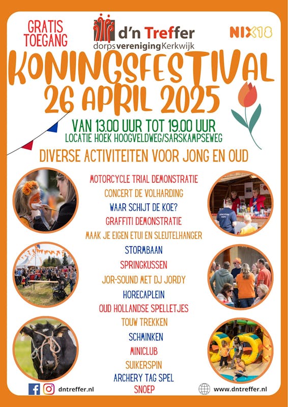 Aan het einde van de maand is het alweer Koningsdag! Daarom organiseren we zaterdag 26 april alweer de zesde editie van het Koningsfestival. De locatie is onveranderd tussen Bruchem en Kerkwijk op de hoek van de Sarskampseweg en de Hoogveldweg.