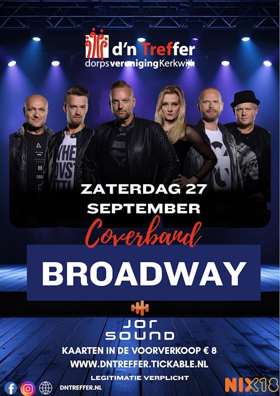 Zaterdagavond 27 september is de feestavond met een spetterend optreden van coverband Broadway, ondersteund door JOR-SOUND. Dit belooft een gezellige en uitbundige avond te worden. De kaarten zijn voor €8,- te verkrijgen in de voorverkoop via dntreffer.tickable.nl en aan de deur voor €10,-.