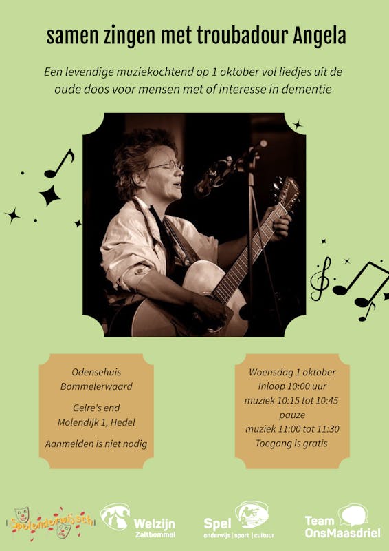 Met troubadour Angela zingen we samen liedjes uit de oude doos. Bekende melodieën die herinneringen oproepen en waar we met elkaar plezier aan beleven.