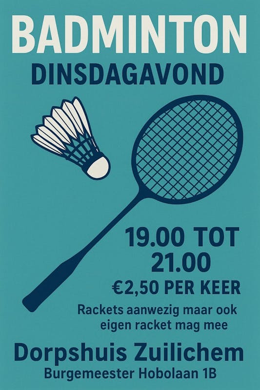 Elke dinsdag badminton, je mag je eigen racket meenemen, maar er zijn ook rackets aanwezig. Kosten €2,50 per keer. Maar kom gerust een keer proef spelen.