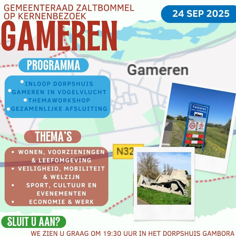 Op woensdagavond 24 september brengt de gemeenteraad van Zaltbommel een bezoek aan Gameren. U bent van harte welkom om in gesprek te gaan met de raadsleden over wat er speelt in het dorp.
