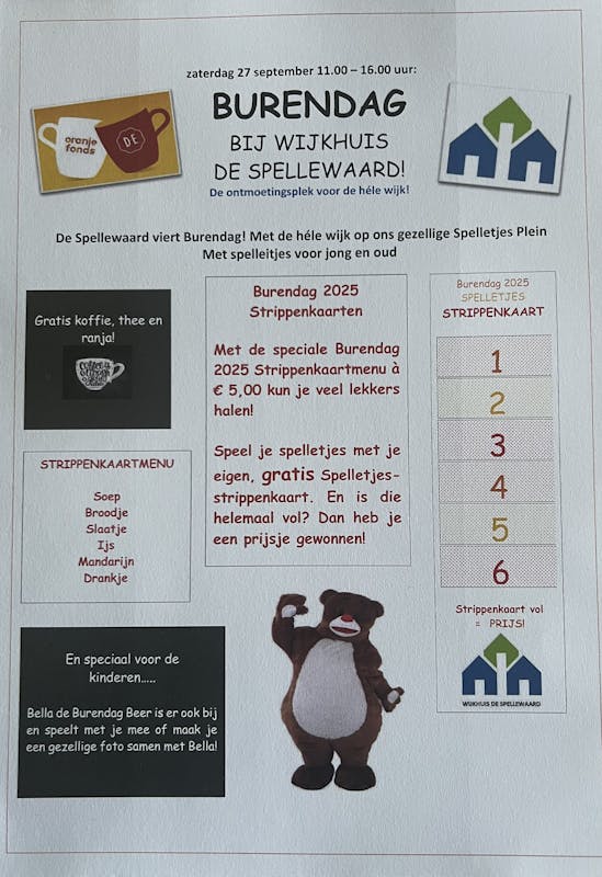 Burendag In Het Wijkhuis! Spelletjes en Eten voor jong en oud. Kom op de foto met Bella de Burendag Beer.