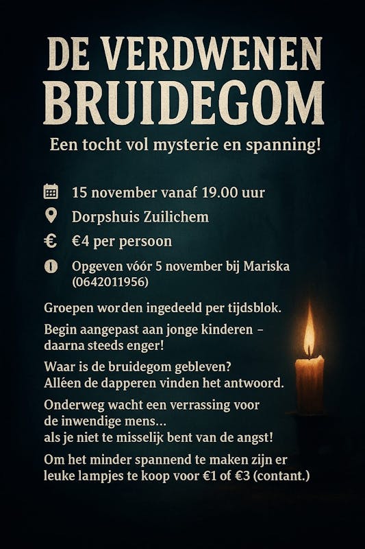 Durf jij het aan?? Zuilichem veranderd in een spannend spookachtig decor.... voor iedereen van jong tot oud, hoe later hoe enger... jullie gaan een tocht maken door het dorp waar je onderweg van alles tegenkomt 👻...zie poster voor verdere info #opgeven verplicht