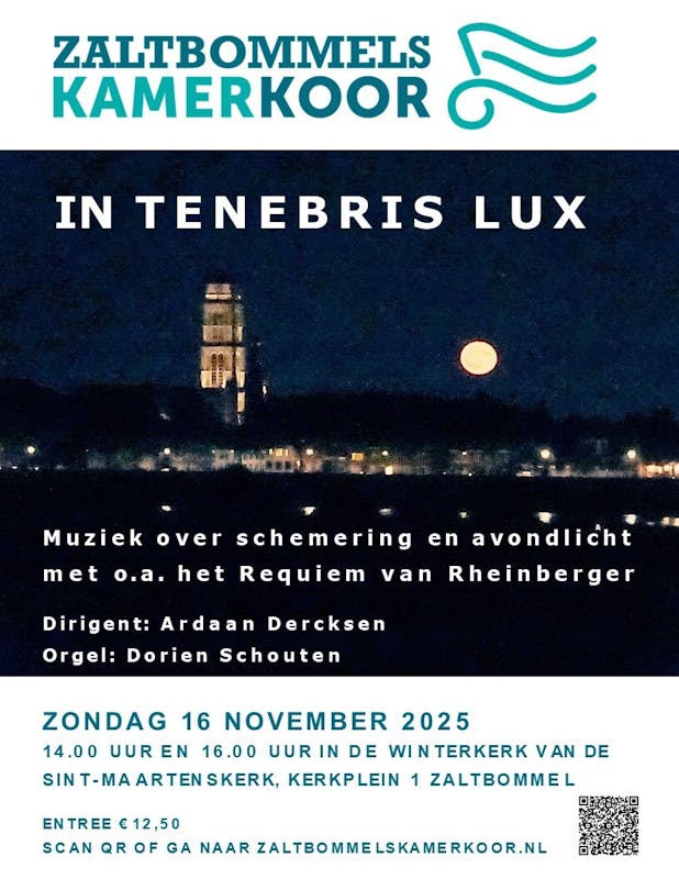 O.l.v. Ardaan Dercksen zingt het Zaltbommels Kamerkoor. Muziek vol troost en herinnering zal klinken tijdens ons novemberconcert. Centraal staat het indrukwekkende Requiem van Joseph Rheinberger: een werk vol ingetogen kracht en serene schoonheid. Het programma wordt aangevuld met composities van Duitse componisten uit de 19e eeuw, die ieder op eigen wijze de thema’s van vergankelijkheid en hoop verklanken. Daarnaast laat Dorien Schouten, op orgel, enkele solostukken horen die het programma extra diepte en kleur geven. Zo wordt het een middag vol mooie klanken en bijzondere momenten.