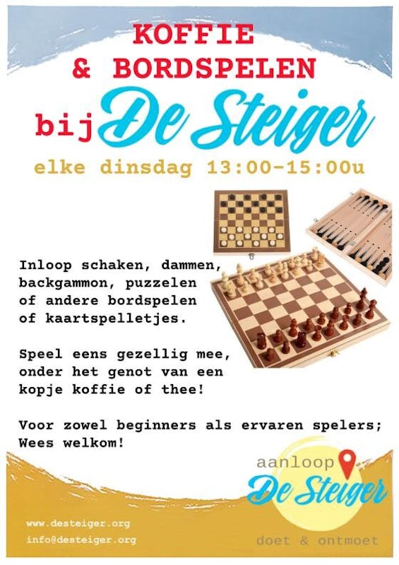 Puzzelen, een potje schaken, kaartspelen, onze vrijwilligers Wil en Freddy zijn overal voor in. Op dinsdagen tussen 13 en 15 uur zitten zij klaar in De Steiger voor een middag bordspelen. Loop gerust binnen. Ervaring met de spellen is niet nodig.