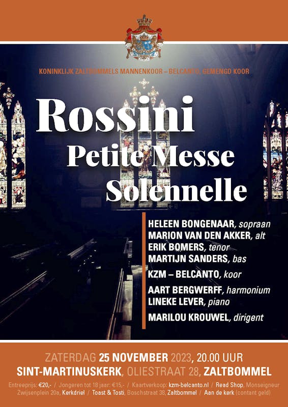 Rossini Petit Messe Solennelle o.l.v. dirigent Marilou Krouwel. M.m.v. Heleen Bongenaar - sopraan / Marion van den Akker - alt, Erik Bomers - tenor, Martijn Sanders - bas, Aart Bergwerff - harmonium en Lineke Lever - piano. Locatie: Sint-Martinuskerk, Oliestraat 28, Zaltbommel. Kaartverkoop : Read Shop, Mgr. Zwijsenplein 20a, Kerkdriel, Toast& Tosti, Boschstraat 38, Zaltbommel of via www.kzm-belcanto.nl