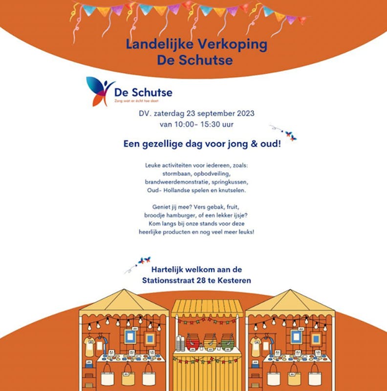 WELKOM! D.V. 23 september 2023 is de Landelijke Verkoping van De Schutse in Kesteren. Veel activiteiten & leuke stands aanwezig. Gezellige dag voor jong & oud! 🤩🍦☀️🥳🍟 Deel zoveel mogelijk! Meer info? klik op deze link