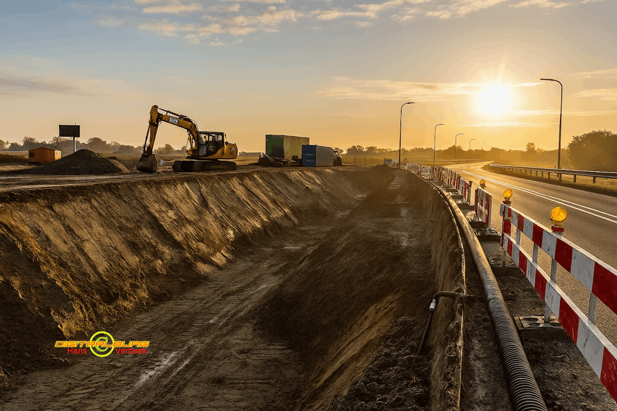 - Noordzijde: Hier wordt nog hard gewerkt. De bestaande sloot is verwijderd en vervangen door een tijdelijke pijpleiding. Volgende week komt er een definitieve leiding rondom de nieuwe toegangsweg.