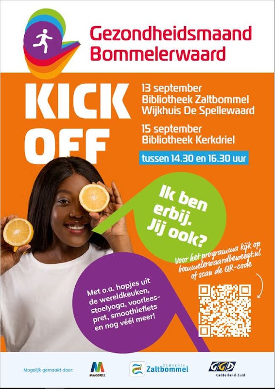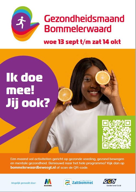 In de Bommelerwaard organiseren de Gemeente Zaltbommel en de Gemeente Maasdriel samen met GGD Gelderland-Zuid vanaf 13 september t/m 14 oktober 2023 de Gezondheidsmaand Bommelerwaard. Zij werken daarin samen met ±30 organisaties in de Bommelerwaard, die de activiteiten uitvoeren. In deze maand kunnen inwoners van de Bommelerwaard op een leuke en eenvoudige manier deelnemen aan activiteiten rondom gezonder leven. Er zijn educatieve, gezellige en sportieve activiteiten voor jong en oud die gericht zijn op voeding, bewegen en mentale gezondheid. Kijk voor een overzicht van de activiteiten op https://www.bommelerwaardbeweegt.nl/projecten/gezondheidsmaand