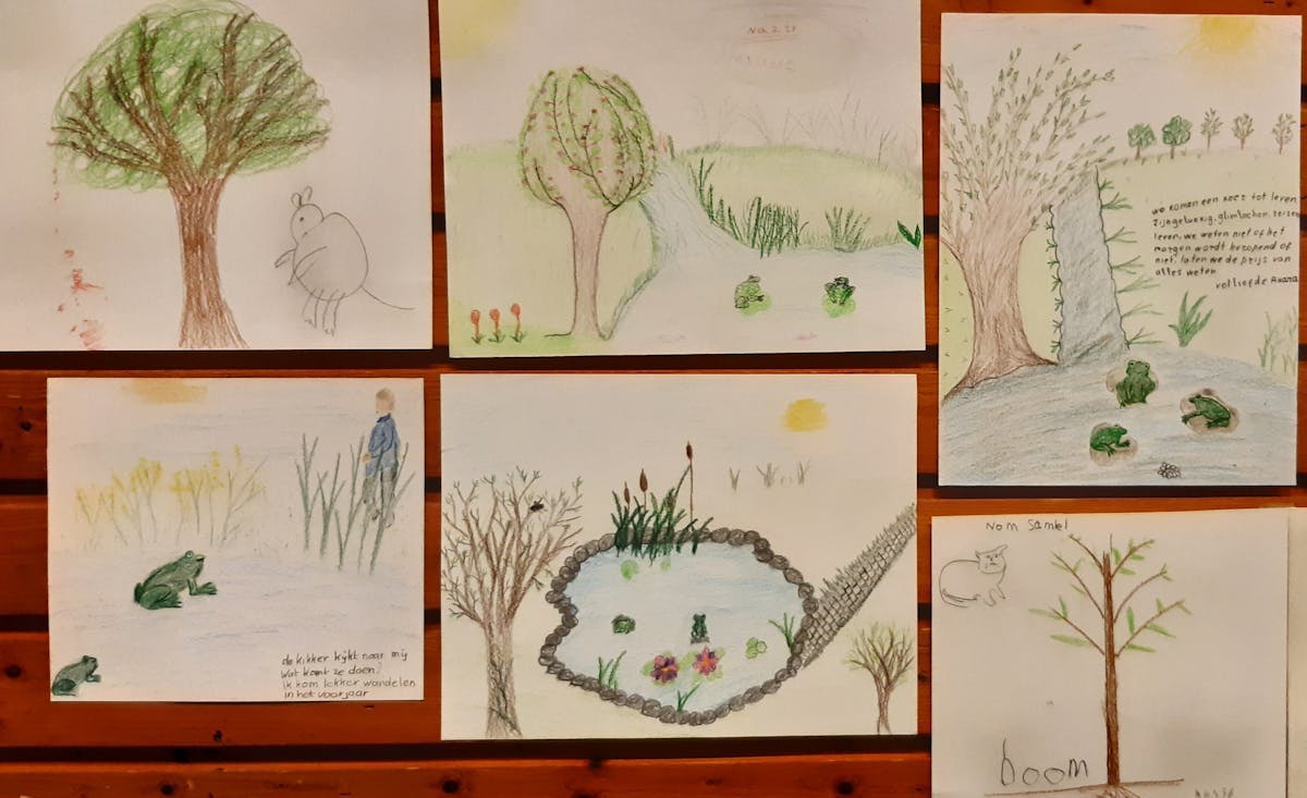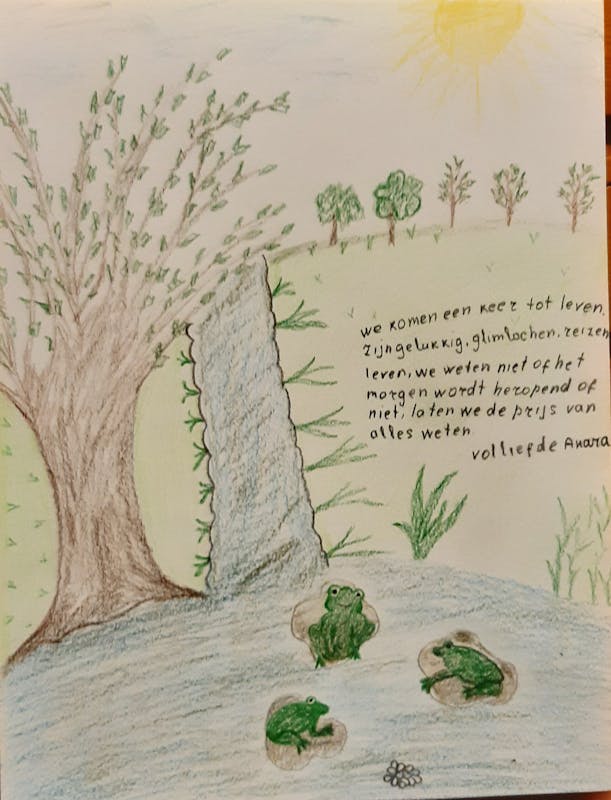En de kikkers, zij laten zich zien en horen. Tekst van een van de deelnemers, vanuit haar taal met hulp van translatie naar het Nederlands vertaald; "We komen een keer tot leven. Zijn gelukkig, glimlachen, reizen, leven, we weten niet of het morgen wordt heropend of niet, laten we de prijs van alles weten. Vol liefde Anara."