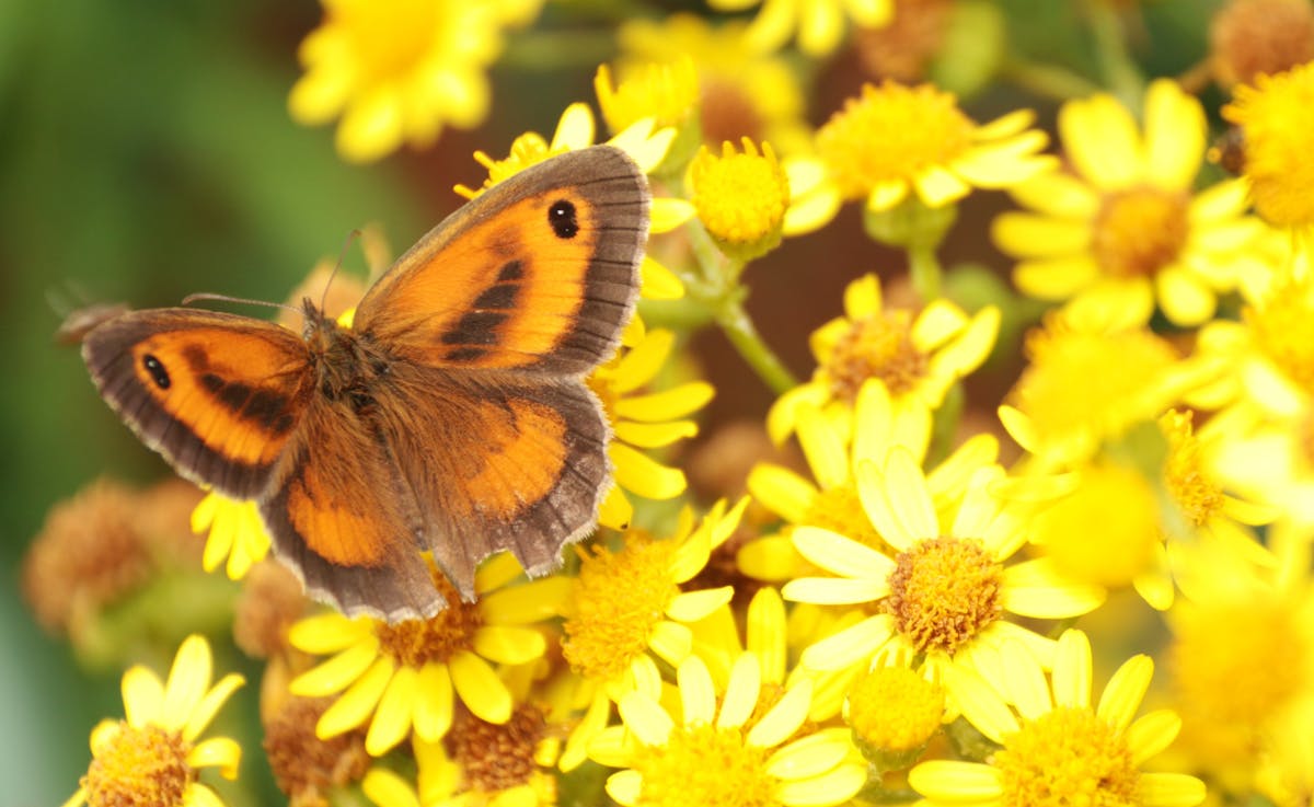 Een zevental Oranje zandoogjes op de weinige nectarplanten, die aanwezig zijn.