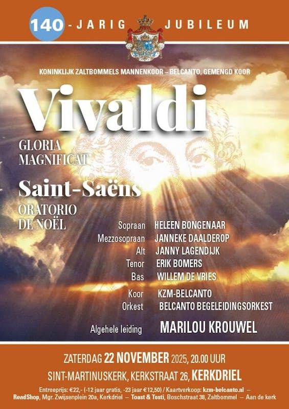 Zaterdag 22 november is de grote dag dat wij, het gemengd Bommelerwaard koor: K.Z.M. Belcanto’ met als repetitieruimte de Zaltbommelse gasthuiskapel, na een goed half jaar studeren de jubelklanken van deze werken mogen uitvoeren.
