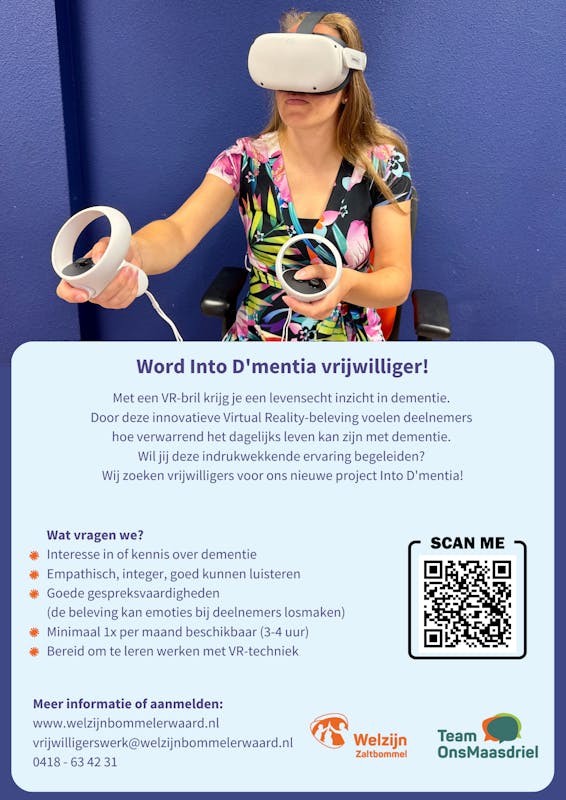 Voor het begeleiden van mantelzorgers en professionals bij de bijzondere VR-beleving ๐๐ป๐๐ผ ๐โ๐บ๐ฒ๐ป๐๐ถ๐ฎ zoeken wij enthousiaste vrijwilligers.