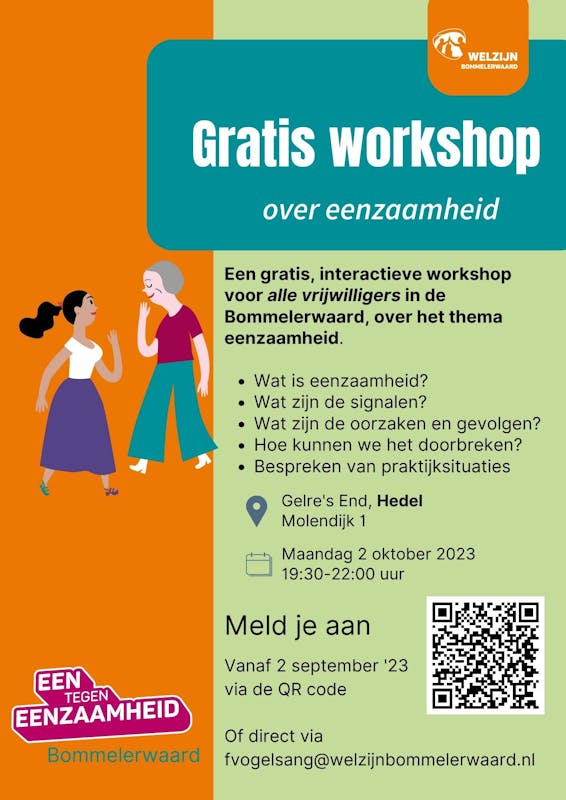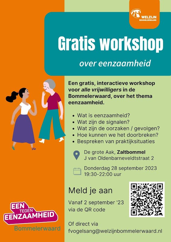 Een gratis, interactieve workshop voor alle vrijwilligers in de Bommelerwaard, over het thema eenzaamheid.