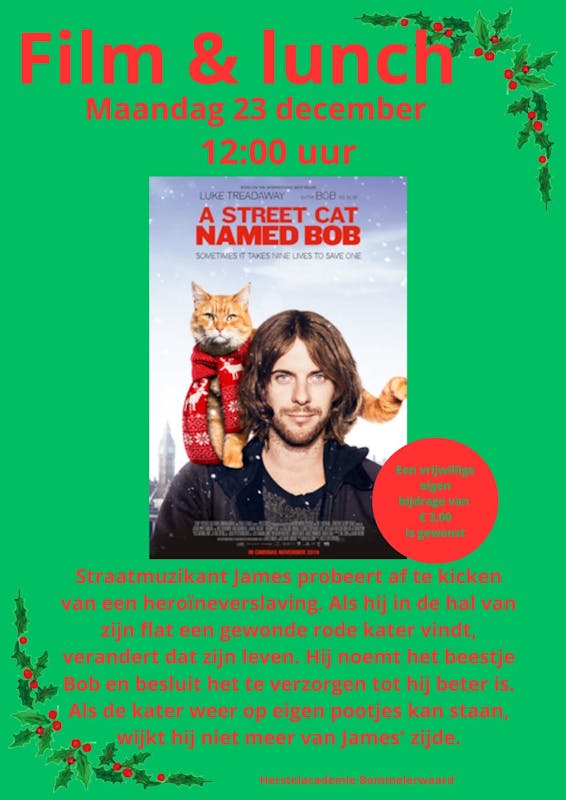 Op 23 December zullen we de laatste film van het jaar gaan draaien. Deze keer hebben we gekozen voor de film 'a street cat named bob'
