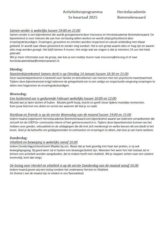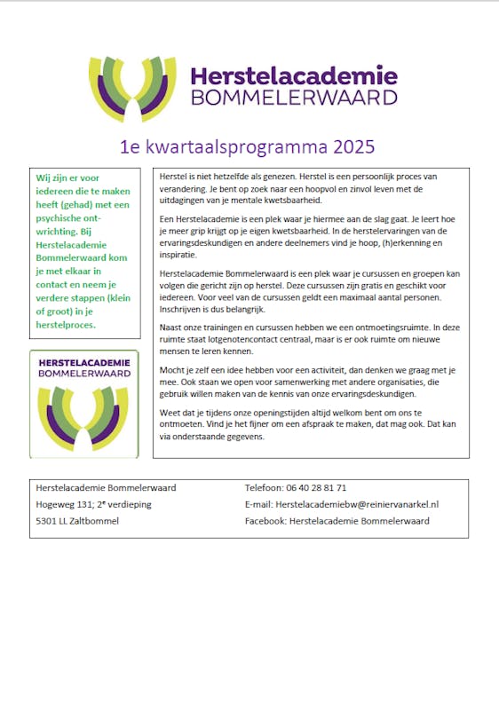 Met trots presenteer ik ons kwartaalprogramma voor het eerste kwartaal van 2025! Dit programma biedt een breed scala aan mogelijkheden om te leren, te verbinden en stappen te zetten in je herstelproces.