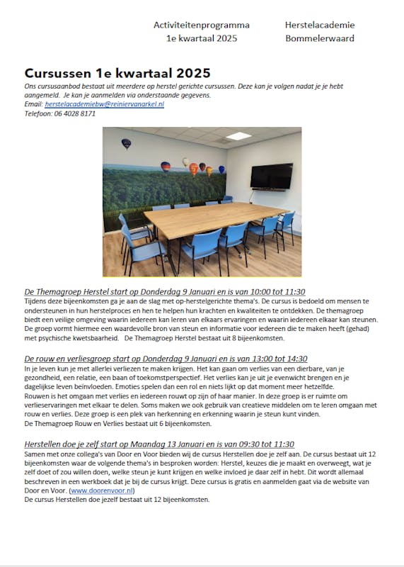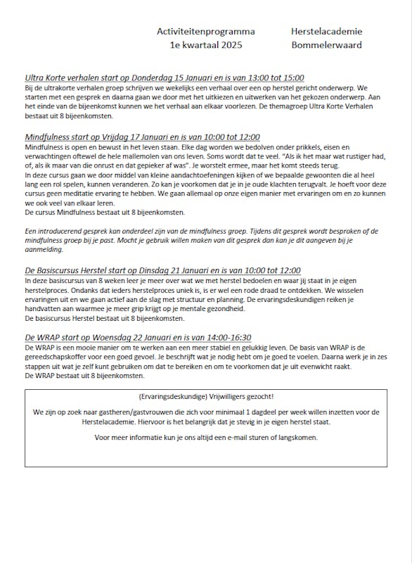 Terwijl we de laatste weken van het jaar ingaan, is het een mooi moment om stil te staan bij wat we hebben bereikt en vooruit te kijken naar wat er nog komt. Bij Herstelacademie Bommelerwaard hebben we voor 2025 weer een veelzijdig programma samengesteld, vol activiteiten, cursussen en ontmoetingen, gericht op herstel en persoonlijke groei.