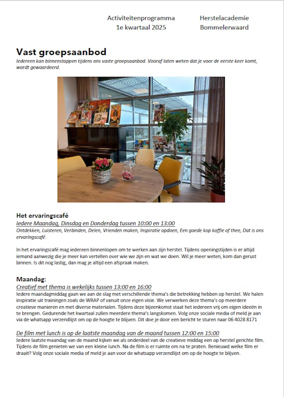 • Vaste groepsmomenten, zoals het Ervaringscafé en de creatieve middagen.
