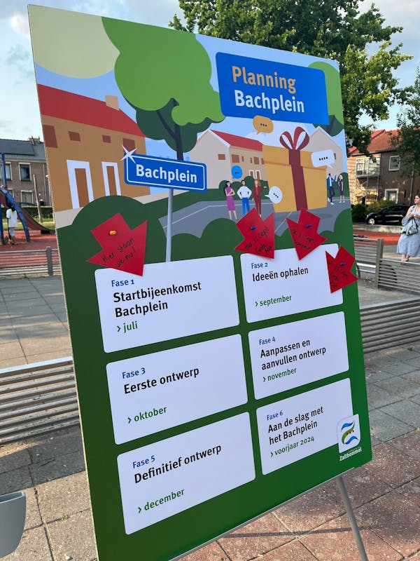 De gemeente organiseerde op donderdag 13 juli de eerste bijeenkomst op het Bachplein voor omwonenden. Tijdens deze bijeenkomst haalde de gemeente de eerste ideeën en wensen van onwonenden op over de inrichting van het Bachplein.